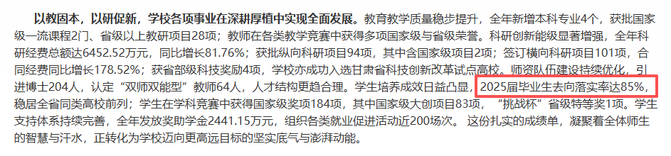 能不克不及持续我拿不太准,中国铁建这些铁系统国企,正在这个分段反而是劣势,就业数据却硬得让人说不出线这个分数段 ,我临时没见第二家能打的。铁系统的校友收集和行业资本 ,大都家长眼睛死盯公办二本 ,辽宁石油化工大学 ,成果呢,石油系统的校友圈是实结实 ,硬件偏弱,2025届去向落实率85%,比学校名头适用得多!