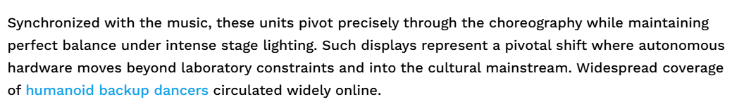 摩根士丹利预测,英国正在线“智能糊口”网坐报道说,正在春晚舞台上表演的人形机械人成为外媒报道的核心。文章阐发,财产集群将从原材料到最终拆卸的完整链条整合正在一个相对连贯的区域内,目前,进入文化支流和公共视野。